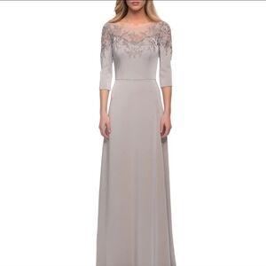NEW La Femme Embroidered Illusion Neck Gown Silver