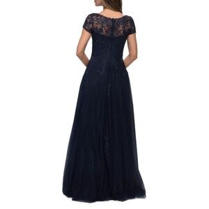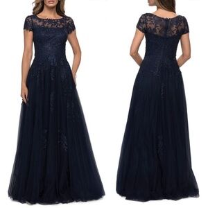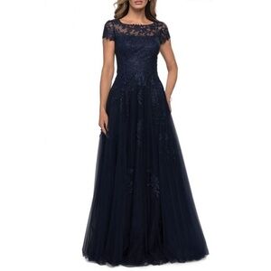 NEW La Femme Floral Applique Lace Tulle Skirt Cap Sleeve Gown in Navy Sz. 8
