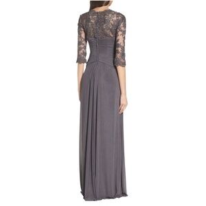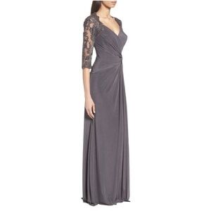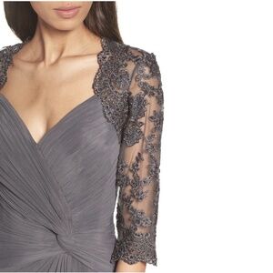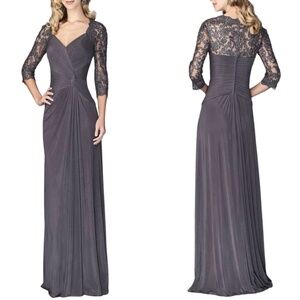 NEW La Femme Ruched Gathered Twist Front Lace Sleeves Embellished Gown Sz. 2