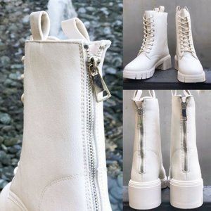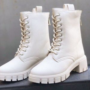 NEW Laced Up Lug Sole Zipper Back Faux Leather Combat Boots Booties Stone Ivory
