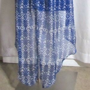 This is an absolutely beautiful and unique bright blue with abstract shapes in white silky lined polyester sleeveless asymmetrical hem ankle length in back and knee length in front peasant style dress by CATO. It is brand new, in perfect condition and a size M Medium The fabric is 100% polyester, is lined w/ 100% polyester and it's machine washable.