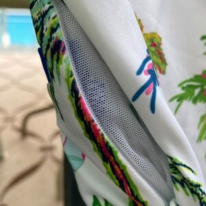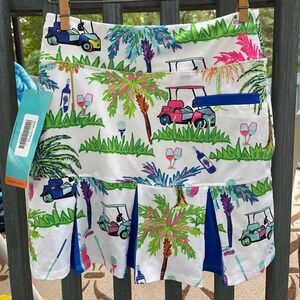 Absolutely adorable and so comfortable, pull on skort with back pleats, 15” length, zippered mesh side pockets on each side. Back pocket is just for detail and is sewn shut. Super cute design with golf carts and palm trees! Bright colors on a white skort. The size is XXS but I normally wear a size XS and this brand I wear XXS, and most people I know agree this brand runs large, and they size down. It measures 15 inches across the top but is very stretchy fabric. Please ask me any sizing questions! This is always a favorite at my club and sells out so fast! MSRP is $150