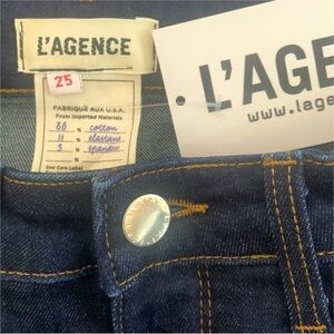 L’agence dark wash, high rise skinny jeans, size 25 NWT. I believe these are their coated denim? They have a slight sheen to them.