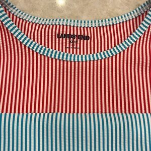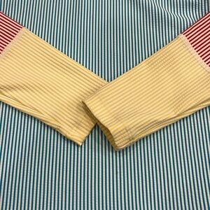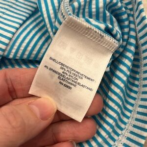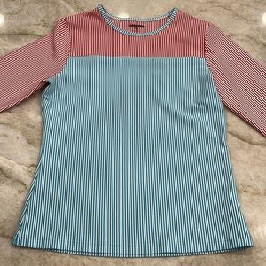 Classic and chic striped rash guard by Lands’ End in a blue, red, and yellow Breton-inspired stripe — giving it a distinctly European, French coastal vibe. Made from a stretchy blend (56% polyester, 40% nylon, 4% spandex) for comfort and easy movement. Size XS. New without tags — never worn.
