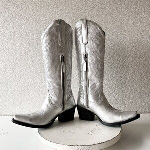 Lane SMOKESHOW Womens Cowboy Boots in Silver Metallic Leather with Western Snip Toe and 15" Tall Mid Calf Shaft