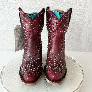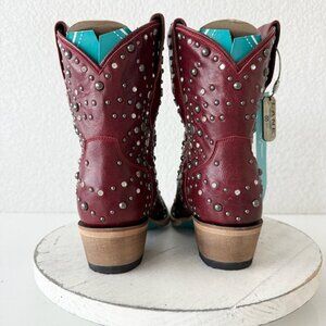 This listing is for a pair of Lane Sparks Fly Womens Cowboy Booties in Smoldering Ruby Red leather with a Western Pointed Ship Toe and Short Ankle Shaft. These are decorated with silver studs.