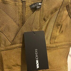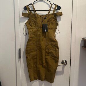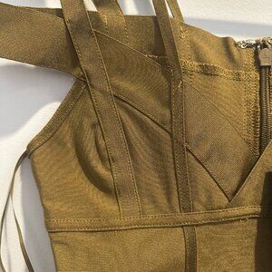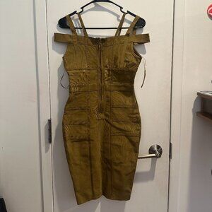 Olive bandage midi dress with a structured, body-hugging fit. Off-shoulder straps and a flattering neckline. Smooth, sculpting fabric. Never worn with tag.