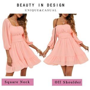 Features: Can be off shoudler or square collar, Sexy open adjustable back ties, Elasticised neckline and shoulders, Partially lined, Half balloon sleeves, Ruched detailing, Invisible back zipper, mini a line design, swing and elegant vintage chiffon dress.