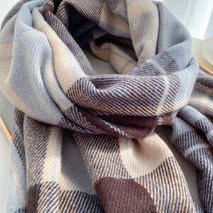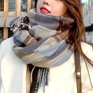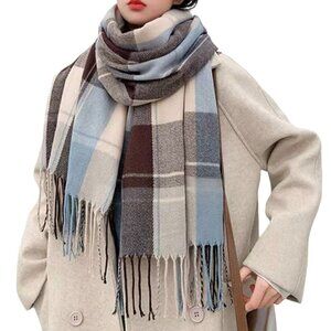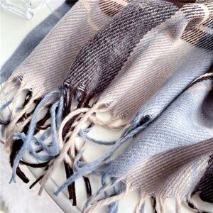 NEW Large Plaid Cashmere Scarf Blue Cream Brown Fringe Winter Wrap Pashmina