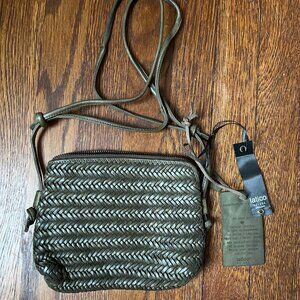 Beautiful Latico genuine leather cross-body bag, never used, soft olive-color leather, woven front, smooth leather back, adjustable length strap, belt loop and zip pocket in back, interior has zip pocket and 3 card slots on one side and a slip pocket on the other side. Size is approx. 7" high, 8.5" wide.