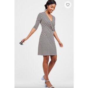 A classic wrap dress in a unique geometric print made exclusively for Le Tote from Laundry by Shelli Segal. Perfect for the office or for your date after work! This versatile dress does it all. Style with black heels or a pastel shoe for a noteworthy fashion moment.