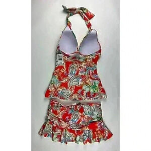 Make a statement in this vibrant halter tankini top and bottom showcasing a bold paisley print. Designed with adjustable straps, it features a shirred front panel for a flattering fit.