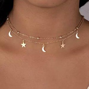 Bohemian golden layered chain chokers featuring adorable little moons and stars.