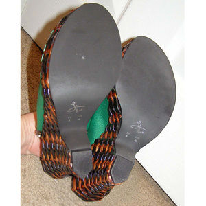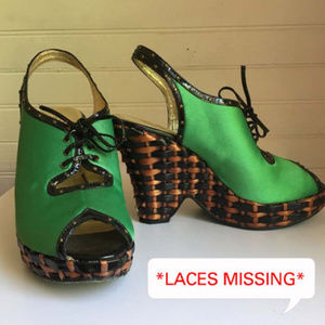 Gorgeous pair of shoes - vibrant shade of green satin and real woven straw wedge heels.