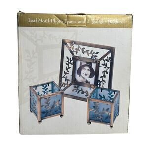 NEW Leaf Motif Bronze Metal Photo Frame and Two Matching Tealight Candle Holders