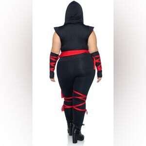 DESCRIPTION: Don't mess with this babe! You'll be the lethal weapon in this plus size Deadly Ninja costume featuring a hooded black jumpsuit with a deep V-neckline, shoulder guards, a red waist sash, fingerless gloves with attached wraps, attached leg wraps, and a matching face mask. (Boots not included.)