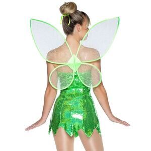 That highlight though! Glow and sparkle from within in this Flirty Fairy costume featuring a green sequin dress with removable clear spaghetti straps, a jagged edge hem, dainty fairy wings, a green hair ribbon, and shoe pom poms. (Nude stockings and shoes not included.)