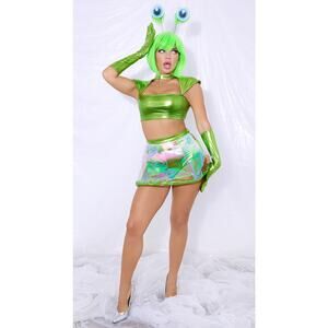 What planet are you from? You'll look out of this world in this Beam Me Up Babe costume featuring a green metallic crop top, an iridescent clear skirt, a matching high waisted panty, alien gloves, and a googly-eye headband. (Wig, face stickers, and boots not included.)