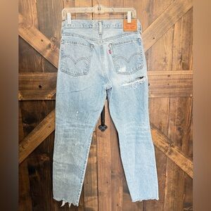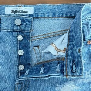 Levi's X Rolling Stones 501 jeans with a distressed look and white paint splatters. These jeans are part of a limited edition collaboration between Levi's and the Rolling Stones. The collaboration celebrates the 50-year history of music and style shared by both brands.