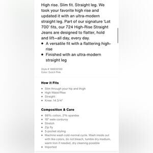 New with tags Levi’s 724 High Rise Corduroy Pants . Straight Legs. Great stretch Zip Fly