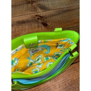 This vintage 90s Lilly Pulitzer lunch bag or purse is in excellent condition! It is brand new with no flaws. The inside has a gorgeous yellow floral design with two inside pockets, and one of them zips. It has a cute palm tree pull zipper! This is labeled a lunch tote, but it could also be used for a purse! This is perfect for Spring and Summer! Measurements are in the photos. The bottom also comes out a bit from the purse, so that protects the material on the bottom!