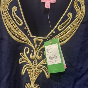 This is a beautiful top by Lilly Pulitzer size extra-large. It is navy with gold beaded, trim, sleeveless Owen Style. NWT