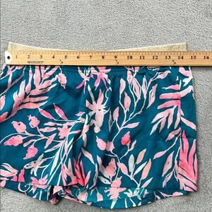 Vibrant floral print shorts with a gold waistband. Features pink and blue colors.