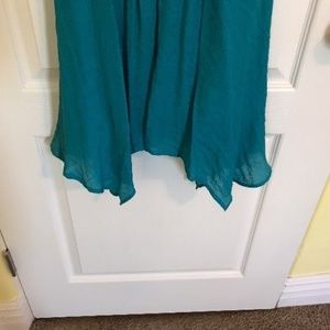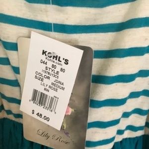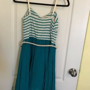 This dress has never been worn, still has tags. It is an adorable aqua and cream color with cream and brown belt. Super cute and great for spring and summer. Dress has spaghetti straps and has a lining so dress is not see threw.