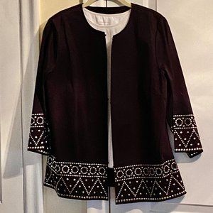 NWT Elegant, refined collarless cardi-jacket with 3 fabric-covered hook and eye inside closures. The jacket is decorated with gold-tone studs in an engaging geometric pattern of circles and triangles around the wrists and bottom. It is made of 97% mid-weight cotton and 3% spandex and is machine washable. The jacket is 24" long with 17"wrist-length sleeves. Armpit to armpit is 16.5." Extra studs and hook/eye closure are included. This versatile jacket epitomizes classiness when dressed up with a scarf and fancy jewelry but exudes quiet refinement when worn as dressy casual.