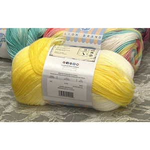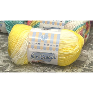 "A soft and easy care yarn that works up to create delightful, self-striping colorways that blend unique and cheerful color combinations. There's even a sophisticated, tonal grey shade for gender neutral projects. One ball makes a baby garment or two balls makes a blanket. This will be your next favorite yarn for baby shower gifts, or your own baby project." (https://www.lionbrand.com/products/ice-cream-yarn).