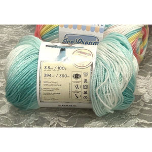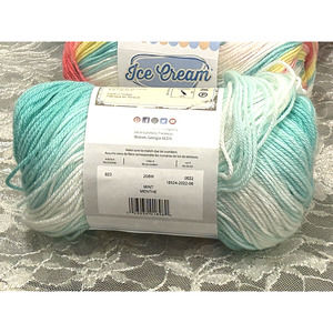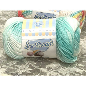 "A soft and easy care yarn that works up to create delightful, self-striping colorways that blend unique and cheerful color combinations. There's even a sophisticated, tonal grey shade for gender neutral projects. One ball makes a baby garment or two balls makes a blanket. This will be your next favorite yarn for baby shower gifts, or your own baby project." (https://www.lionbrand.com/products/ice-cream-yarn).