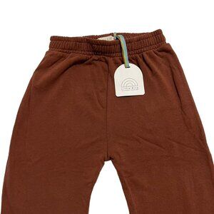 These precious pants feature a pull on jogger style in a brown color material. They have an elastic waistband. There are blue and mint, green diagonal stripes on the front of the left leg. There is a large yellow graphic print of a sun and the words, “Sunny Side Up” on the backside. NWT HTF style. Size 5-6Y