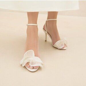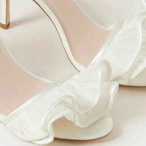 High-heel sandal with a ruffled upper in pearl organza. Features an open toe and an adjustable ankle strap. 3.5-inch heel. Made completely from vegan-friendly materials.