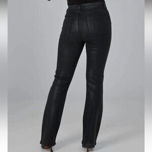 “ The Billie is a bootleg jean with a high rise waist and versatile enough for day or night–especially in Coated Black, a laminated black on top of black denim that creates a leather like finish.