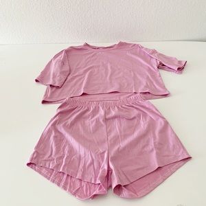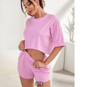Sold as a set, 92% polyester 8% Elastane, elastic waistband. Model is wearing a size small.