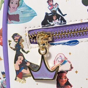 Carry your essentials in royal style with this beautiful New with Tags (NWT) Loungefly Mini Backpack! This Exclusive design showcases a detailed pattern of Disney Princesses dresses and iconic motifs.