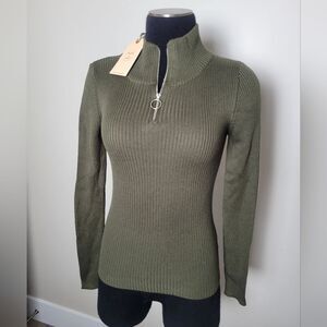 Brand new with tags. Super cute, super stretchy and flattering. Trendy sage olive green color. Full length sleeves. Quarter Zip with round metal pull tab. High quality soft material. Tagged size medium measures approximately 23 inches long 13.5 inches underarm to underarm laid flat.