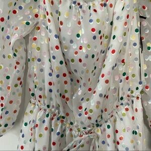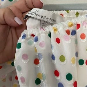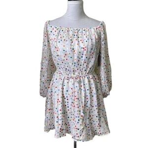 World Traveler Mini Dress by Lovers + Friends. NWT. Excellent unused condition. Elasticized neckline can be worn off shoulder or on shoulder. Features elasticized waist tie and Chiffon sleeves. Fully lined. Lovers + Friends exudes ease, creating an effortlessly chic look that is California cool. Material: : 70% Viscose, 30% Poly Color: White background, Rainbow Dots
