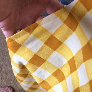 So cute and sunny dress in a comfy Aline shape. Love the roomy design. Perfect for warm weather and that piece of pie after lunch. Width at bust 17.5”. Hip 25”. Length 38.5”.