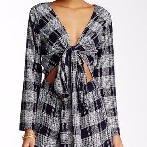 NEW! Lucy Paris Tie-Front Romper Plaid Long sleeve Large Navy & White Lined