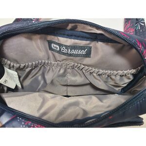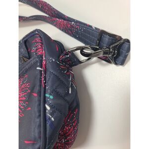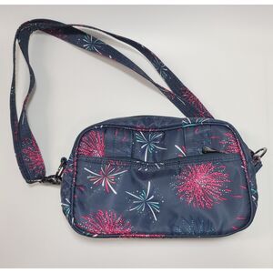 This Lug Carousel crossbody bag features a festive navy blue fireworks print and a stylish quilted pattern on the front. It is a compact and practical accessory with a comfortable adjustable strap, multiple exterior zipper pockets, and an interior slip pocket to keep your essentials organized on the go. Perfect for travel or everyday use.