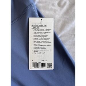 The NEW Lululemon Wunder Train HR Tight 28'' Size 8 Leggings in Oasis Blue are a high-rise pair of athletic leggings designed for various activities such as gym training, running, yoga, and cycling. Made from a blend of nylon and Lycra elastane, these leggings are machine washable and feature a solid blue color with a pull-on closure. They offer compression in the buttocks, waist, and leg areas, providing a slimming and shaping effect. With features like quick dry, moisture-wicking, and stretch fabric, these leggings offer comfort and support for active women on the go.