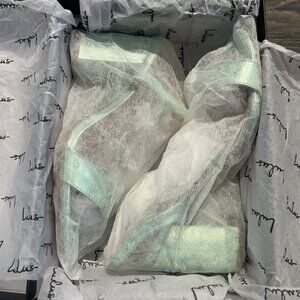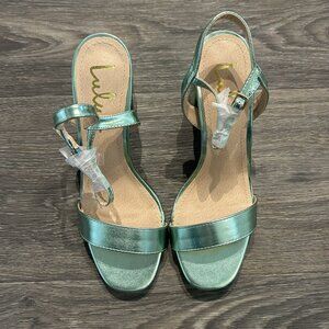NEW Lulus 7.5 Arya Green Metallic High Heel Sandals Chunky Block Strappy Heels