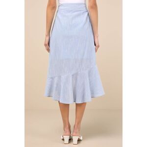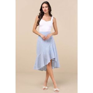 The Lulus By the Bay Light Blue and White Striped Ruffled Midi Skirt is perfect for standing in the ocean breeze! Lightweight woven fabric, with a white striped pattern throughout, forms this asymmetrical midi skirt with a high-waisted fit that flows into a fluttering high-low hem. Hidden side zipper.
