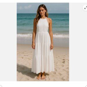 NEW Lulus Cream Crochet Embroidered Halter Tiered Boho Maxi Dress Beach Bridal