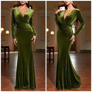 NEW Luxe Velvet Plunge Long Sleeve Mermaid Maxi Gown Dress Olive Green