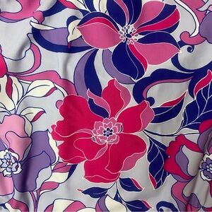 Vibrant floral one-piece swimsuit with a halter neckline. Features a mix of pink, purple, and white colors.
