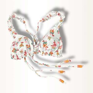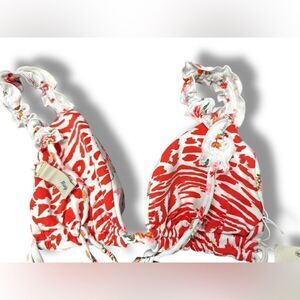 Triangle bralette top with ruffled straps. With removable soft cups. Tie at back. White. Floral print. Cheeky coverage bottom. Ruffle on sides. Floral print. White. / Red White Animal Print