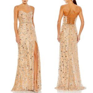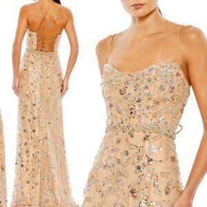 NEW MAC DUGGAL 68049 SZ 12 EMBELLISHED FLORAL LACE UP NUDE GOWN