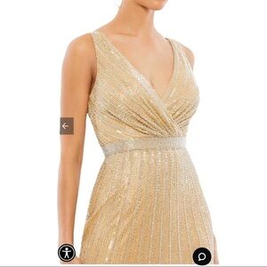 NEW MAC DUGGAL Gold Champagne Beaded Plunging Surplice Maxi Gown Size 12